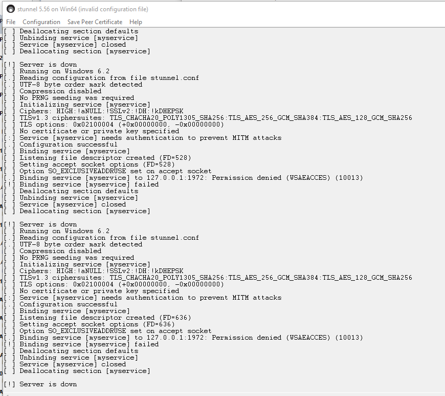 I would avoid running any service as administrator. Once the config file(s) has been read, stunnel just shuttles data between ports. There is no reason for it to have elevated privileges. Also, Thomas may not know that on Windows, anyone can bind to any port, so port-permissions shouldn't be an issue even when not running as Administrator. Have you "disabled" any ports[1]? netsh int ipv4 show excludedportrange protocol=tcp It's also possible that you are trying to bind to 127.0.0.1:1972 while another process has already bound to 0.0.0.0:1972[2]. Is anything else listening on [anything]:1972? Hope that helps, -chris [1] https://stackoverflow.com/questions/48478869/cannot-bind-to-some-ports-due-t... [2] https://docs.microsoft.com/en-us/windows/win32/winsock/so-exclusiveaddruse