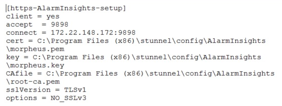As requested, Posting my configuration. [https-App-setup] client = yes accept = 9898 connect = <<source-ipaddress>>:9898 cert = <<stunnel-installationdirectory>>\config\App\morpheus.pem key = <<stunnel-installationdirectory>>\config\App\morpheus.key CAfile = <<stunnel-installationdirectory>>\config\App\root-ca.pem sslVersion = TLSv1 options = NO_SSLv3