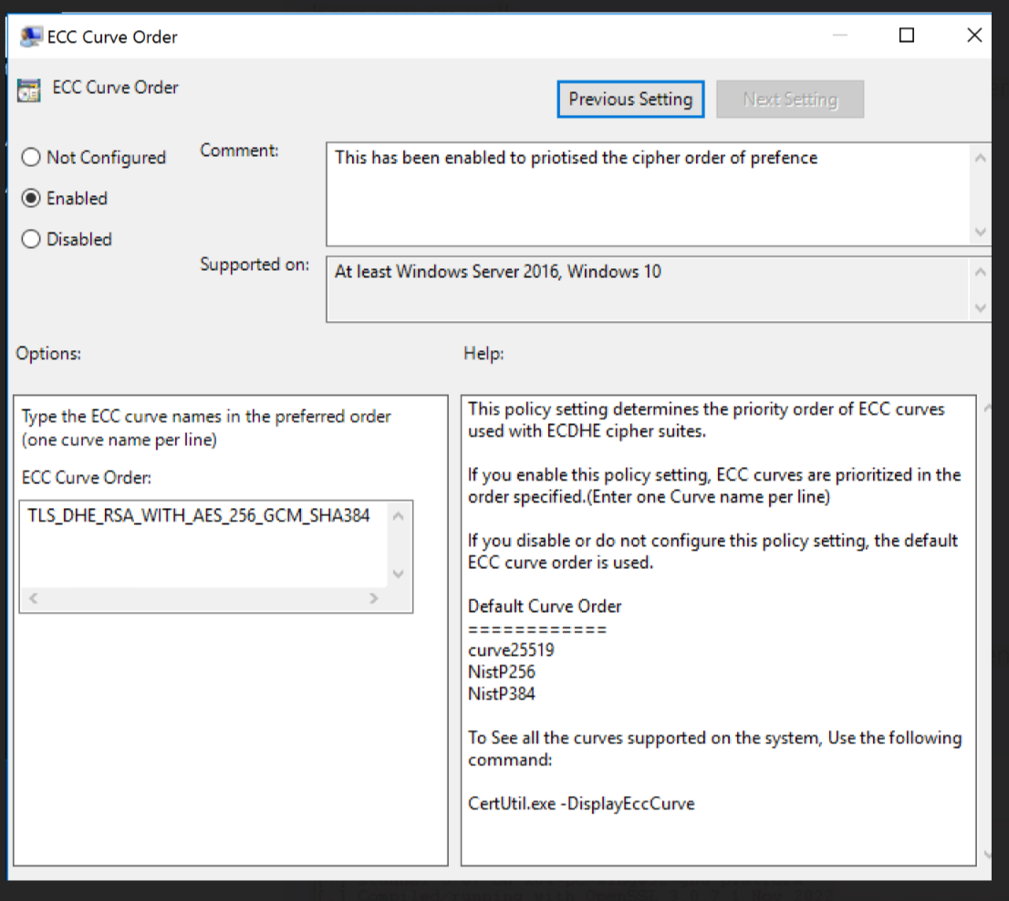 Hi, Have you updated the stunnel config file with your ciphersuites choices? From: https://www.stunnel.org/static/stunnel.html#SERVICE-LEVEL-OPTIONS ciphersuites = CIPHERSUITES_LIST select permitted TLSv1.3 ciphersuites A colon-delimited list of TLSv1.3 ciphersuites names in order of preference. This option requires OpenSSL 1.1.1 or later. default: TLS_CHACHA20_POLY1305_SHA256:TLS_AES_256_GCM_SHA384:TLS_AES_128_GCM_SHA256 Regards, Duncan Morris OpenVMS Consultant Engineer CDL www.cdl.co.uk<http://www.cdl.co.uk/ohttp:/www.cdl.co.uk/> Advanced Notice of Annual Leave: 18th-28th July 2024 24th Aug–4th September 2024 T: +44 (0)161 480 4420 T: +44 (0)161 475 4111 F: +44 (0)161 480 4415 M: +44 (0)7872 526049 CDL - EXTERNAL From: Glick, Daniel <DanielGlick@arbuthnot.co.uk> Sent: Monday, June 10, 2024 11:28 AM To: stunnel-users@stunnel.org Subject: [stunnel-users] help required with stunnel cipher set up You don't often get email from danielglick@arbuthnot.co.uk<mailto:danielglick@arbuthnot.co.uk>. Learn why this is important<https://aka.ms/LearnAboutSenderIdentification> Classification: Restricted Dear All, Objective : We have been informed by Euroclear that we must use the following ciphers below with our stunnel connection to them TLS_DHE_RSA_WITH_AES_256_GCM_SHA384 TLS_DHE_RSA_WITH_AES_128_GCM_SHA256 Server details : [cid:image001.png@01DABB44.99433620] The required cipher has been defined as being the first in the list. [cid:image002.png@01DABB44.99433620] Information security has confirmed that the cipher has been enabled [cid:image004.png@01DABB44.99433620] However after rebooting the server and starting stunnel – the old ciphers are still being used [cid:image005.png@01DABB44.99433620] Please can anyone point us in the right direction as to what we are doing wrong. Thank you Daniel Glick Application Specialist, Investment Management & Finance Platform Arbuthnot Latham & Co., Limited This email and any files transmitted with it are confidential and intended solely for the use of the individual or entity to whom they are addressed. If you have received this email in error please notify the sender and delete it from your system. Internet communications are not secure and therefore Arbuthnot Latham & Co., Limited does not accept legal responsibility for the contents of this message or any damage sustained as a result of this email or its attachments. Any views or opinions presented are solely those of the author and do not necessarily represent those of Arbuthnot Latham & Co., Limited or any of its affiliates. Please take some time to read our Privacy Notice<https://www.arbuthnotlatham.co.uk/privacy-notice/>, which provides information on what personal data we collect from you, what we do with it and who it might be shared with. Registered in England and Wales No. 819519. Arbuthnot Latham & Co., Limited is authorised by the Prudential Regulation Authority and regulated by the Financial Conduct Authority and the Prudential Regulation Authority. Arbuthnot Latham & Co., Limited is on the Financial Services Register under Firm Reference Number 143336. Arbuthnot Latham & Co., Limited Arbuthnot House 7 Wilson Street London EC2M 2SN Tel : +44 (0)20 7012 2500 www.arbuthnotlatham.co.uk<https://www.arbuthnotlatham.co.uk/> [https://www.cdl.co.uk/assets/site-wide/social-newshub-icon.jpeg]<https://www.cdl.co.uk/media/newsletter.html>[https://www.cdl.co.uk/assets/site-wide/social-vacancy-icon.png]<https://www.cdl.co.uk/careers/vacancies.html>[https://www.cdl.co.uk/assets/site-wide/social-twitter-icon.png]<http://twitter.com/CDL_Software>[https://www.cdl.co.uk/assets/site-wide/social-linkedin-icon.png]<http://www.linkedin.com/company/cdl-cheshire-datasystems-ltd->[https://www.cdl.co.uk/assets/site-wide/social-facebook-icon.png]<https://en-gb.facebook.com/CDLSoftware> ________________________________ Please consider the environment - Do you really need to print this email? This email is intended only for the person(s) named above and may contain private and confidential information. If it has come to you in error, please destroy and permanently delete any copy in your possession, and contact us on +44 (0)161 480 4420. The information in this email is copyright © CDL Group Holdings Limited. We cannot accept liability for any loss or damage sustained as a result of software viruses. It is your responsibility to carry out such virus checking as is necessary before opening any attachment. Cheshire Datasystems Limited uses software which automatically screens incoming emails for inappropriate content and attachments. If the software identifies such content or attachment, the email will be forwarded to our Technology department for checking. You should be aware that any email that you send to Cheshire Datasystems Limited is subject to this procedure. ________________________________ Cheshire Datasystems Limited, Strata House, Kings Reach Road, Stockport, SK4 2HD Registered in England and Wales with company number 3991057 VAT registration: 727 1188 33